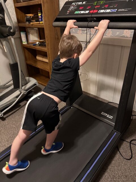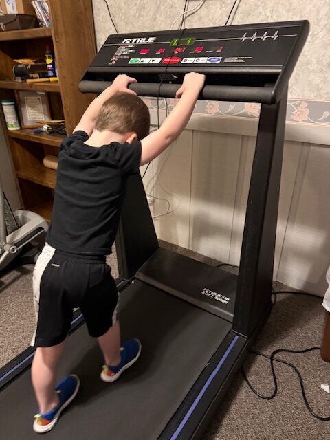 You have to pay attention on the treadmill! This is why they only get to go 1 mile an hour on it. Then, of course, they both had to get on it. Tessa now was hanging on, and Connor was walking backwards (still too confident!)