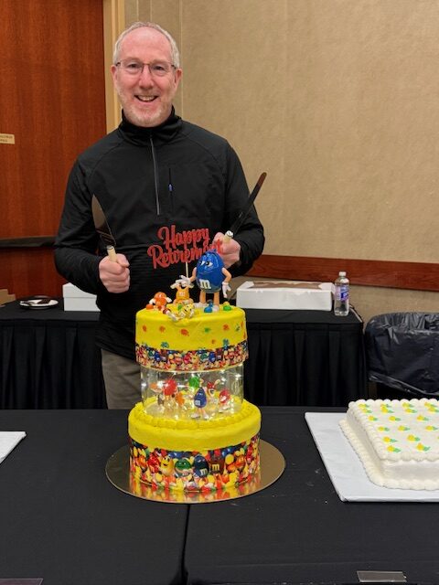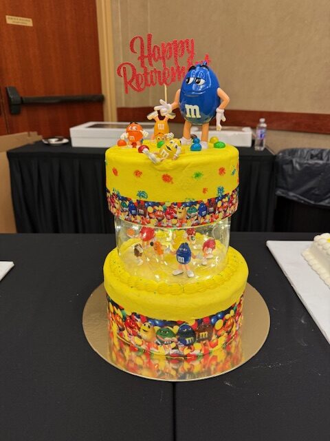 Since I am now going to be doing the cooking, I got an apron to wear for “my first time”. It says “Retired. Under new management. See wife for details!” How fitting. I have now been under “Chris” management for “my last time”, and the baton has been turned officially over to Sarah. She gave me an incredible clock to have on my desk at home. Then the hugs starting happening for “my last time”, well at least at work anyway! Chris made me another M and M cake for the celebration on Saturday!