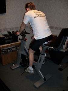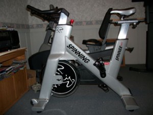 New piece of equipment for exercising…a Spinner bike. This simulates more closely your outdoor bike, as far as mechanics. You can work on form, “the spinning” technique for riding outdoors. You can change the resistance on it to help simulate hills as well. Makes for a nice change of pace, and you can really get a good workout with this.