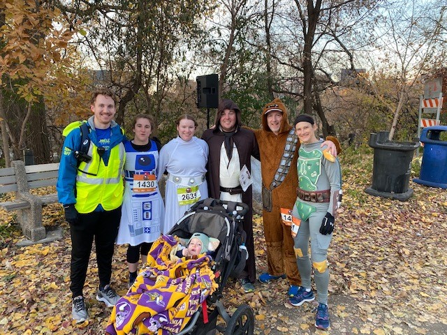 I did not have a chance to blog last weekend as we were gone to Minneapolis. What a great weekend though. I got to spend the whole weekend with family. We all started out early Saturday morning doing the Halloween Run. My son Nick works for Minnesota Run Company, and we went to do one of their races. He had to work that weekend, but the rest of us dressed up as Star Wars characters. I was Chewbacca, and my grandson Connor was baby Yoda!