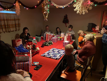 We get as many of us crammed around the old ping pong table as we can when it comes time to eat, and open presents. Then rotate around when opening presents. This tradition began before my kids were even born, and my oldest are now 25!