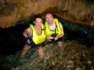 The snorkeling was very good in Mexico. Part of the adventure the one day, after snorkeling out in the ocean covering about a mile, we came back and went snorkeling in one of the caves. Very colorful, and scenic, but very cold, or as they said, “very refreshing!” Here is Sarah and I posing at the turn around point.