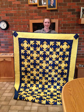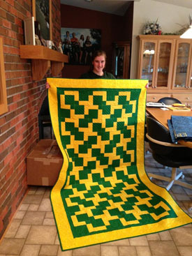 Grandma Folk made the girls a going away college present…a quilt with their school colors on it. Here they are showing them off!