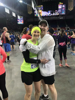Here we are getting ready to do the Fargo half! We each ran our own race, but believe me, I was thinking of her and how she was doing the whole time as well…and waiting at the finish line for her to get across.