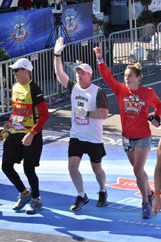 We all had fun! I have always wanted to run races with my kids!!! Then, Sunday, it was time for the marathon…26.2 miles. I did not know how much I had left. I had already put in 22.4 miles in 3 days! Carissa Hauck, Steve and Carletta’s daughter, ran the marathon with me. She was very reluctant to do this, and her longest run had been 8 miles, done several months before this. She had never come close to running 26.2 miles at one time. She is in the military, stationed at Fort Bragg. She may not have been in running shape, but this kid is in incredible shape otherwise. If anybody was going to be able to do this, it was her. She ran with me from start to finish, and we picked up the pace as we went. Our second half was 10 minutes faster than the first half. We were on fire! So many people, so many things to do…I had not felt this good in a marathon ever! Here we are coming across the finish!