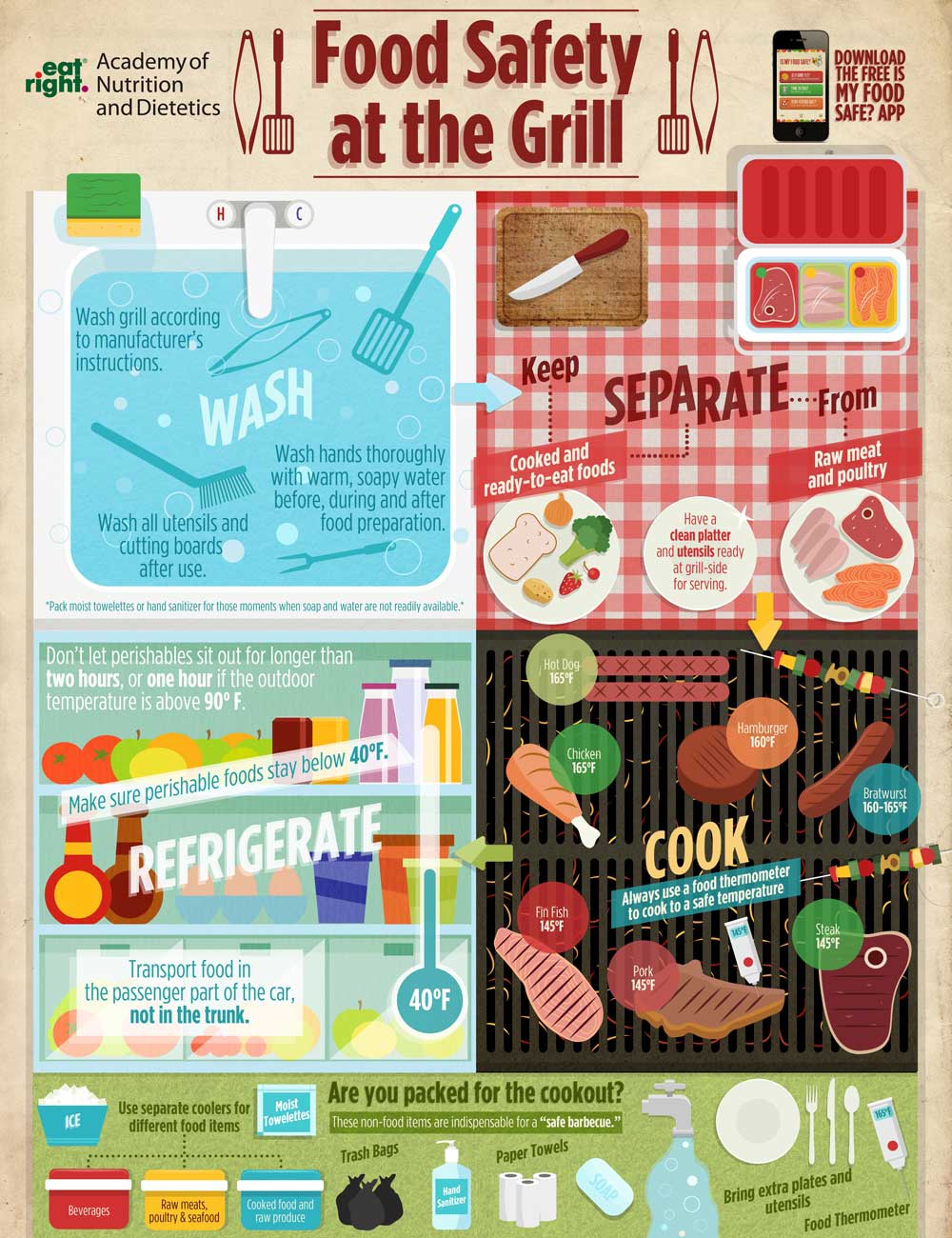 Summer is the perfect time to grill! Everyone loves to grill but there are some important food safety issues to be aware of when grilling. First off it is crucial that you keep raw meats/poultry and cooked meats/poultry separate. Have an extra clean plate (not the one that had the raw meats) next to the grill to place the cooked meats on. Make sure to keep hot food hot and cold foods cold, and transport any food in the car and not in the trunk especially in these hot months. Have a meat thermometer next to you and make sure your meats reach the appropriate temperature. Keep meats and fruits/vegetables separate on your grill, so raw meats do not contaminate the fruits/vegetables. Have a safe grilling season and remember your food safety! Refer to the infographic below for more grilling food safety tips plus the temperature all your meats should get to.