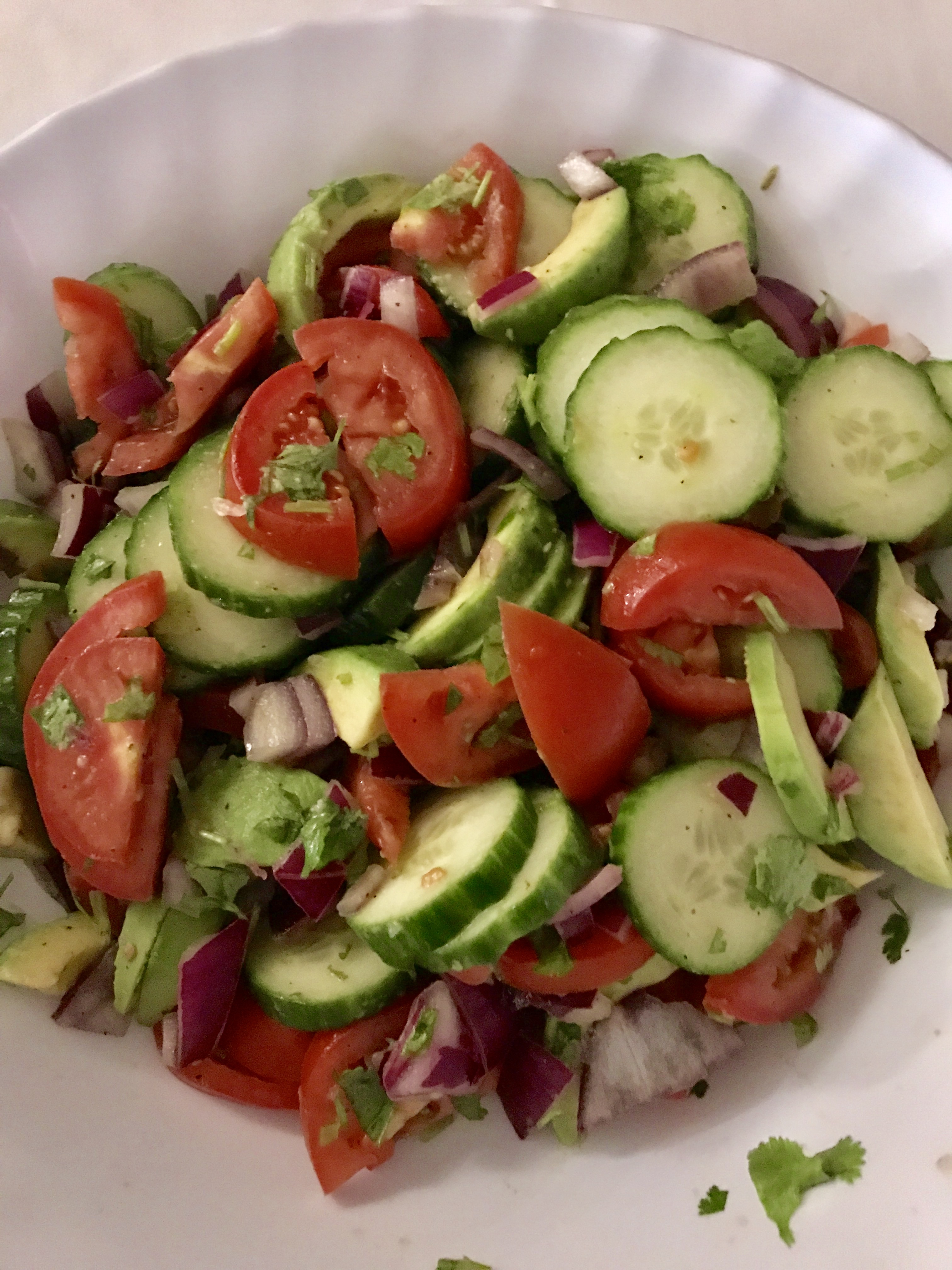 Directions: place sliced cucumber, tomatoes, avocados, onion, and cilantro in a large bowl. Toss with olive oil, lemon juice, salt and pepper. Enjoy!!