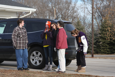 Here, Molly and Sarah are getting their numbers ready to wear for the Annual Turkey Day Race/Walk. For our family, it has started to become a family tradition for Thanksgiving. This obsiously has for a lot of other families too, and many of the same people come each year. Thanksgiving is a time when a lot of the families get back together for the holidays, and this is a good way to make it a part of tradition.
