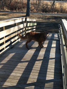 Yes, it is getting colder outside, but we still have no snow, or very little. Here Sarah is getting ready to go out this sunday morning with Buddy for a walk, who is ready anytime! You just have to be smarter about what you wear.