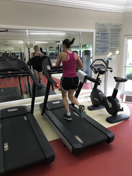 The Wellness Center is great to exercise indoors. They have a lot of variety. You can see my shadow riding the bike on the side wall. I listen to music, and can watch a lot of other people there all doing the same thing…exercising. They may all be exercising for different reasons, but they are all there. It also helps to motivate yourself when you have other people around you trying as well.