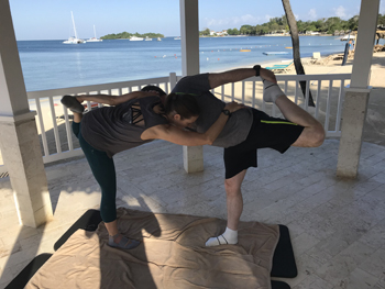 Some things just say it all. I am going to ease back into running again this week. I had a set back the last 2 weeks, and physical therapy has definitely been helping. I will resume that again this week. The rest of the exercise is just not the same when I can’t run. I have been having a really hard time trying to stay motivated. The weather is only making this worse. Everybody else is crabby because of the weather, but I think I am more crabby because I have not been running, and then the snow and cold just compounds it even more. My foot was doing pretty good with the walking, so time to start testing it again this week. Back to the pool again too! I sure hope by Spring when the weather does get better that I will be back outside on the road again running. I feel like I have been missing out on a lot this past 3 months or more. My daughter wrote in her blog this week that you really don’t know how much you miss something until you can’t do it. Right on! I have been struggling not being able to run more. At least I can do something to keep exercising, otherwise I would really be miserable! Sarah and I got in on the classes by the “fitness instructor” at the Sandals resort, Romario. He was a riot. He took this picture of Sarah and I doing our class on couples stretching along the beach. Who says exercising can’t be fun!