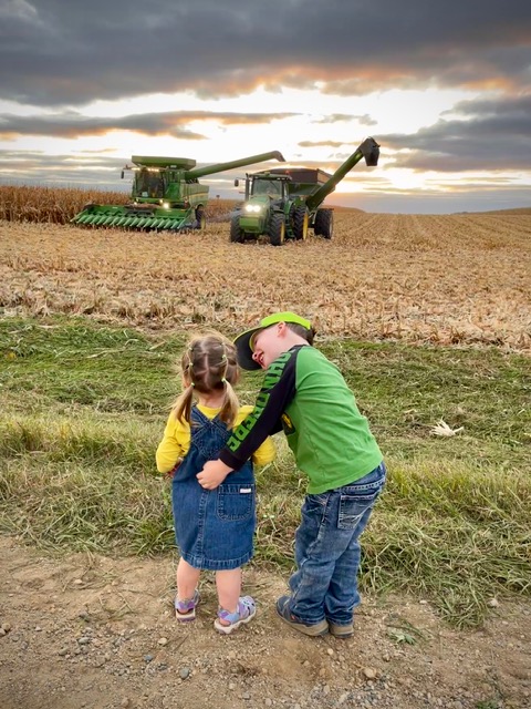 The family out harvesting at sunset. My 4-year-old grandson Connor is explaining about life to my 2-year-old granddaughter Tessa! Carefree. Worry free. Just there for each other. We could learn a lot from this!