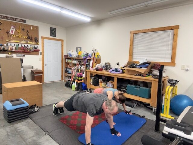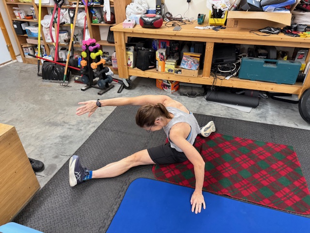 Sarah too, here stretching before our workout in the “Reiflex Center”–our gym in the garage.
