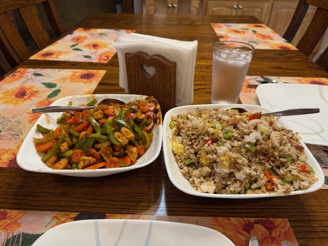 Sweet and sour chicken. Fried rice. Working together. Eating together. The smell of it all rising into the warm sunny evening. Cooking something together. Slowing down enough to savor. And the taste…wow!