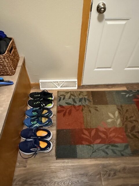 These are my shoes by the back door. First pair is my running shoes. 2nd pair is my walking shoes. 3rd pair is my weightlifting shoes. All there, ready to go. Ready each day. We are ready to compete!
